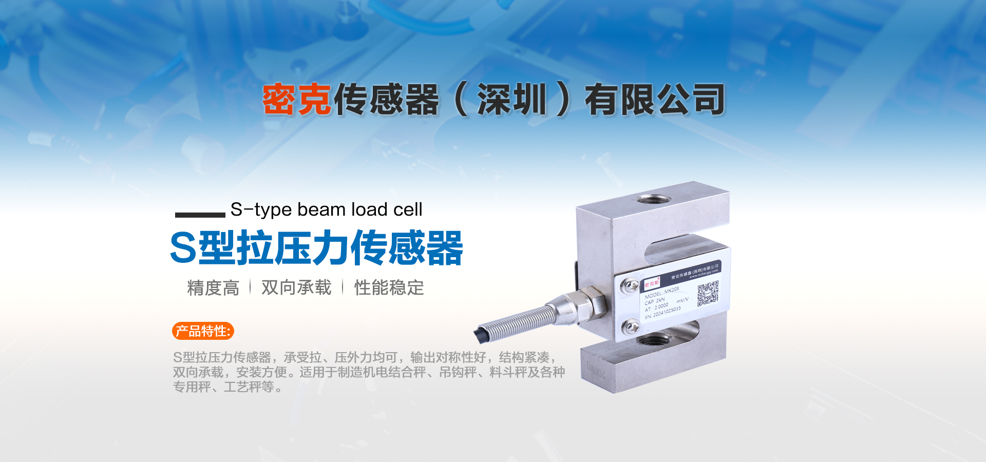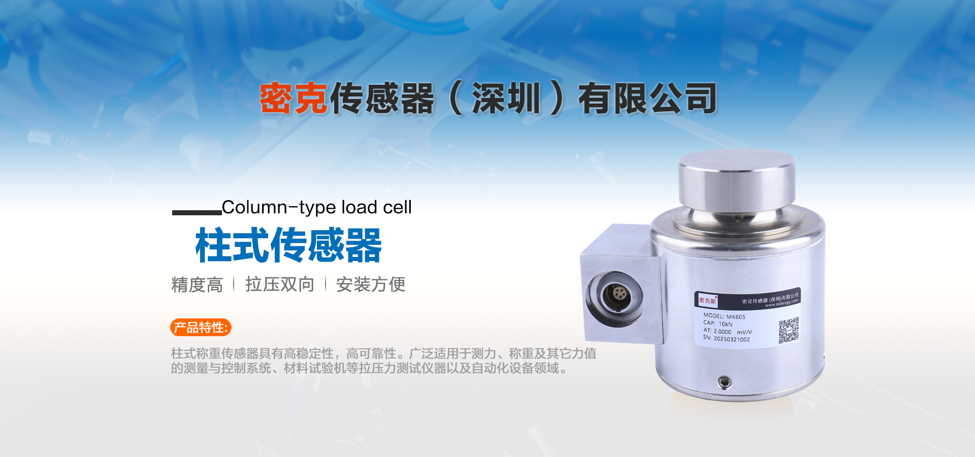 密克傳感器(深圳)有限公司主要生產的產品有測力傳感器、稱重傳感器、拉力傳感器、壓力傳感器、扭矩傳感器,多維力傳感器,電子引伸計等各類力學和稱重傳感器、及其配套儀器儀表和模塊附件的工廠。